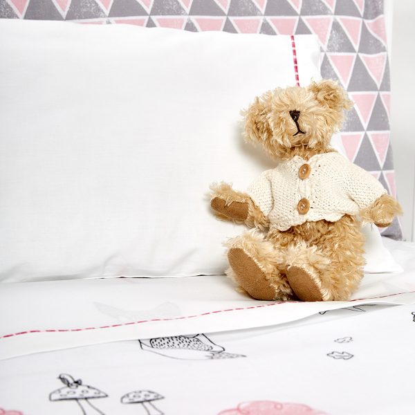 Jogo Lençol de Bebé branco com rolinho rosa composto por lençol 100×160 cm, lençol capa com elástico 60×120 cm e fronha 30×50 cm.