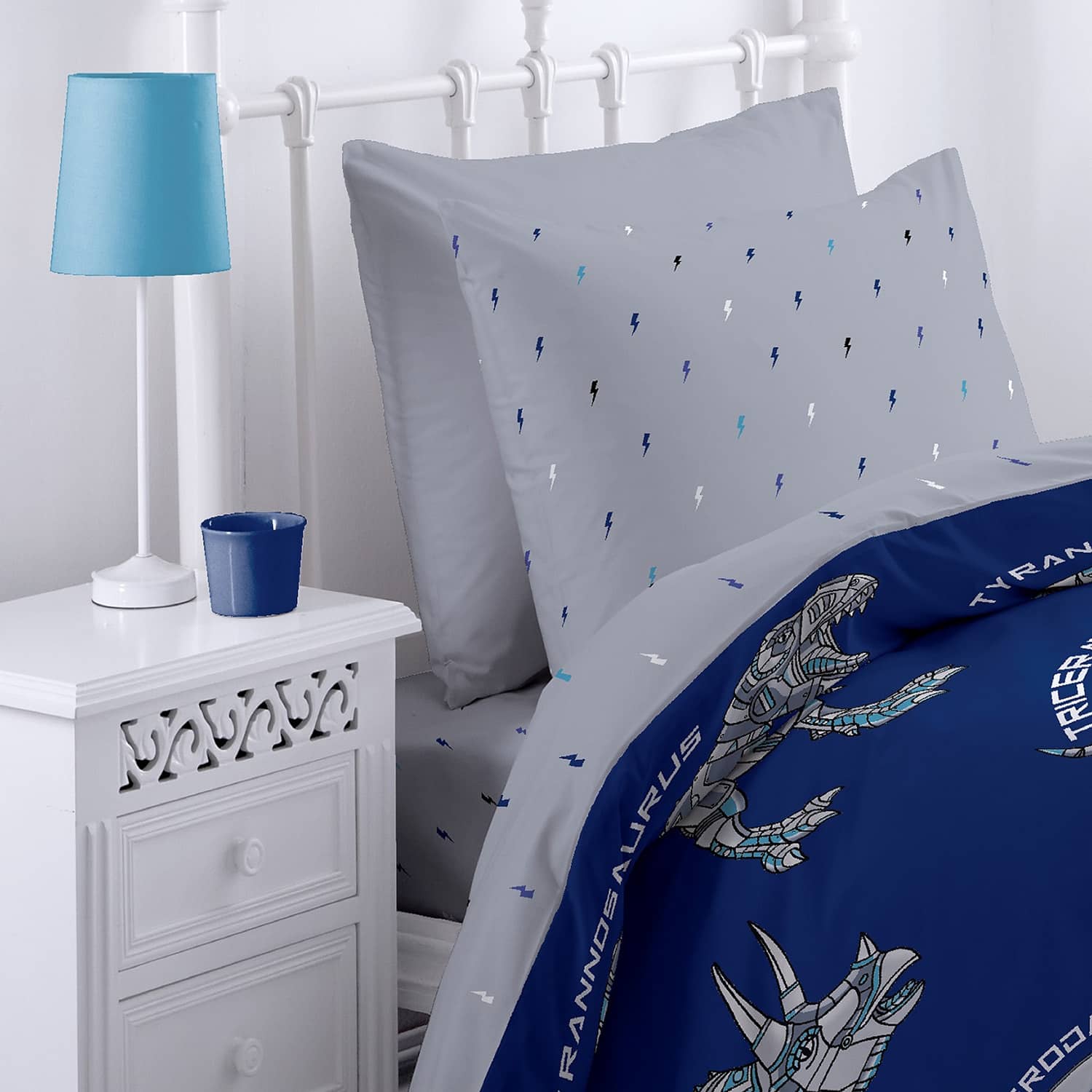 O jogo capa de edredão Azul Dinobot, que inclui fronha(s), está disponível para o tamanho Solteiro (160×220 / 50×70 cm) e Casal (240×220 / 2x 50x70cm) e Extra Largo 260×240+2(50×70).